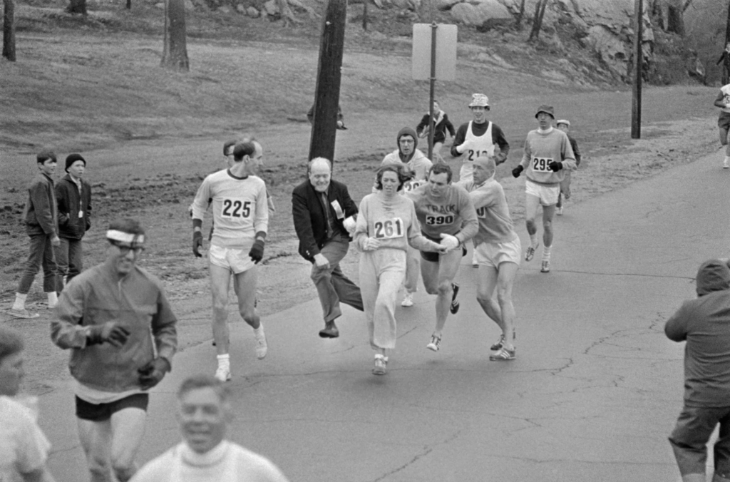 The director of the Boston Marathon tries to grab a lone female runner, Kathrine Switzer, in 1967 when she ran the then all-male race.